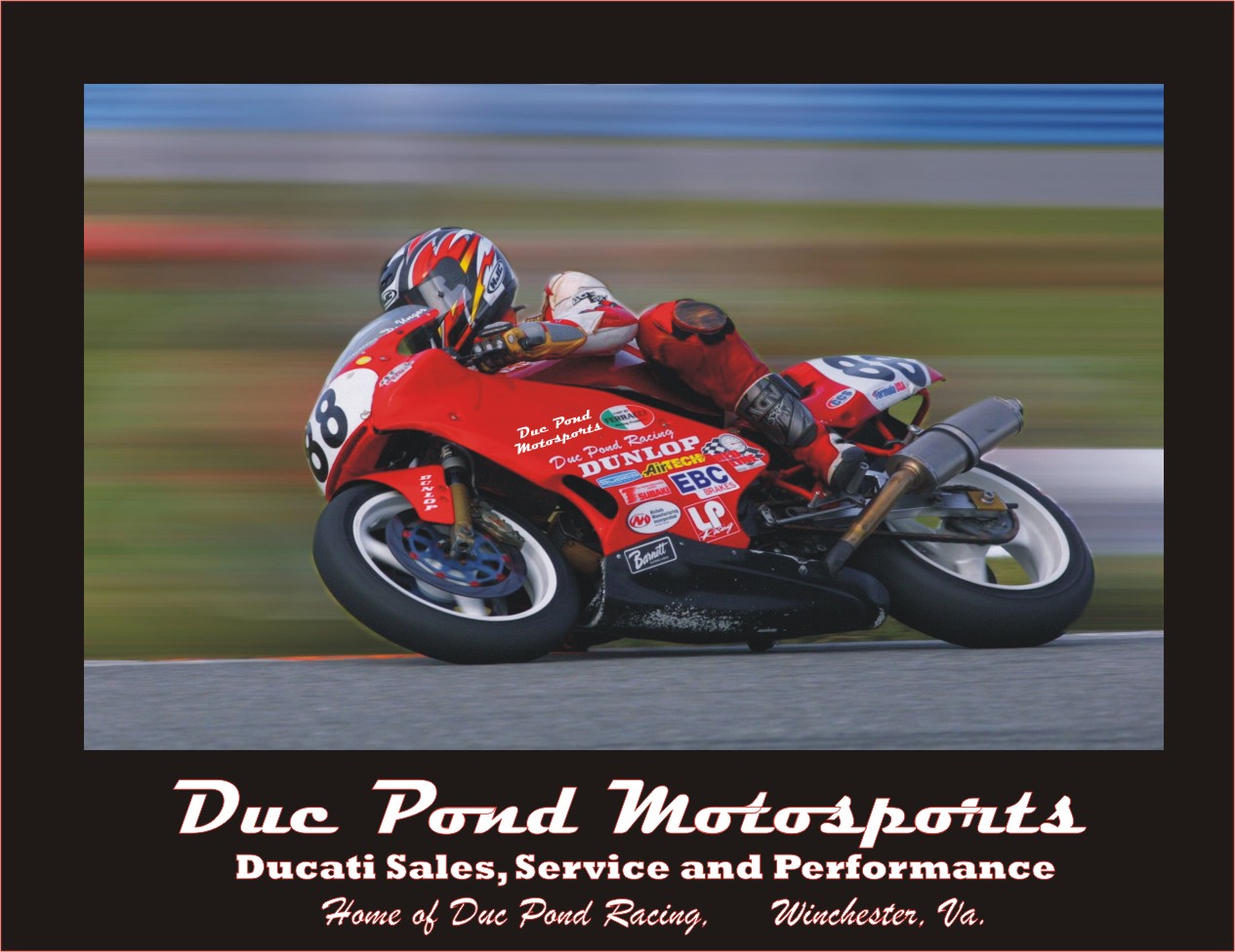 Duc Pond Motosports; fulfilling all of your Ducati needs and desires!! A complete Ducati dealership for all of your Ducati needs... We are the area's only "exclusively Ducati" dealership! Duc Pond is teaming with Roger Lyle for a "Track Day" at Summit Point Main. July 5. Call for details!! Contact Donnie at (540) 667-3498 for more information! |